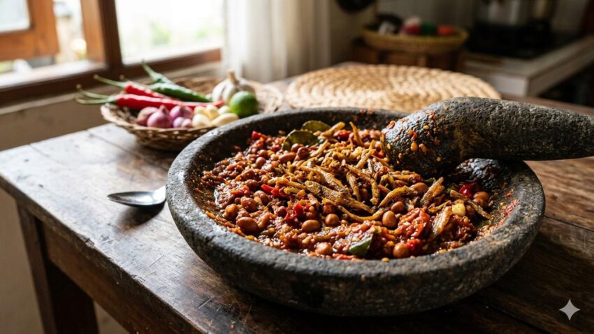 3. Haluskan bumbu halus menggunakan ulekan atau blender dengan sedikit minyak. Hindari menggunakan air saat memblender agar sambal tidak mudah basi.